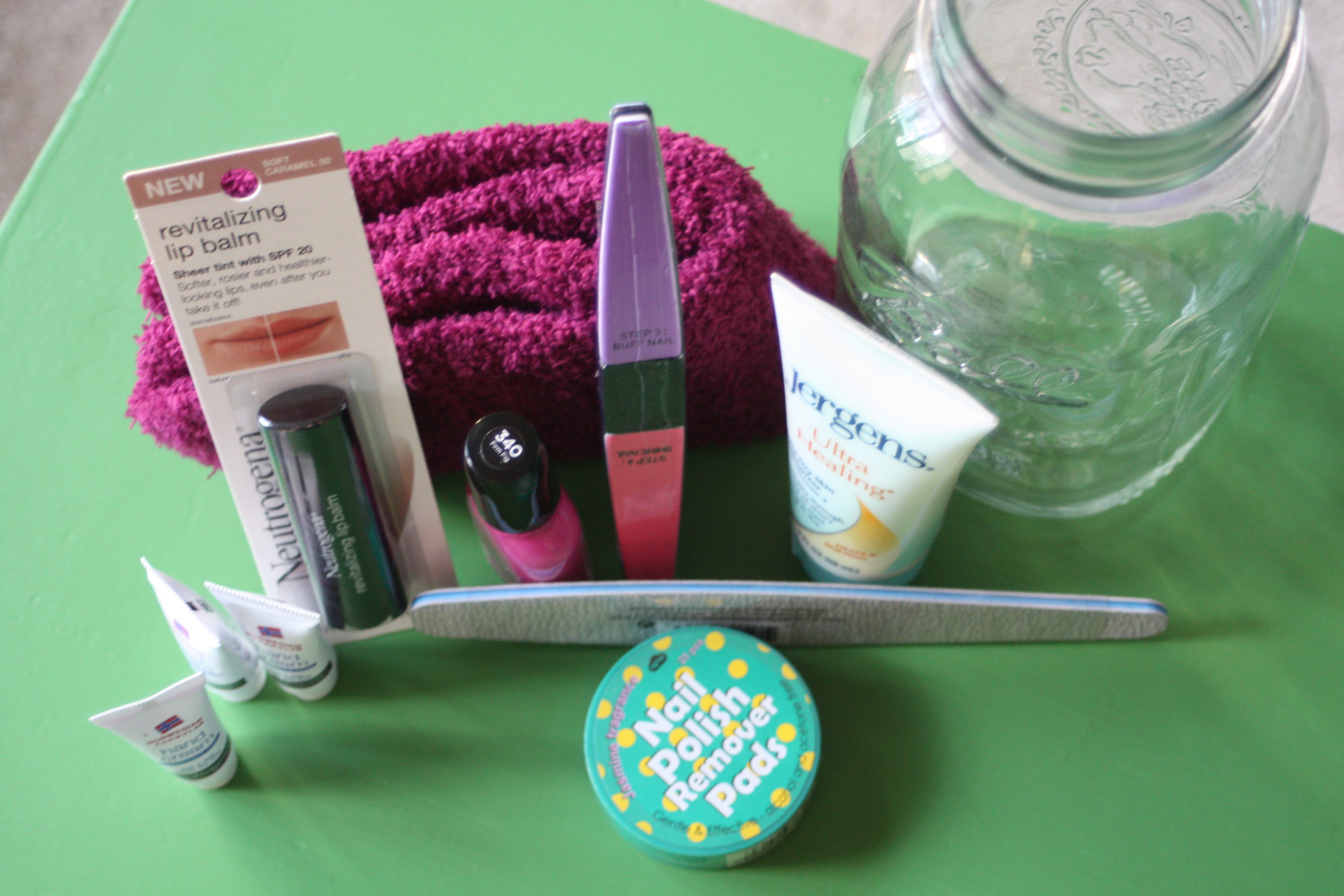 I had hand cream (2 kinds), lip balm, nail file and buffer, nail polish, polish remover and fuzzy socks.
