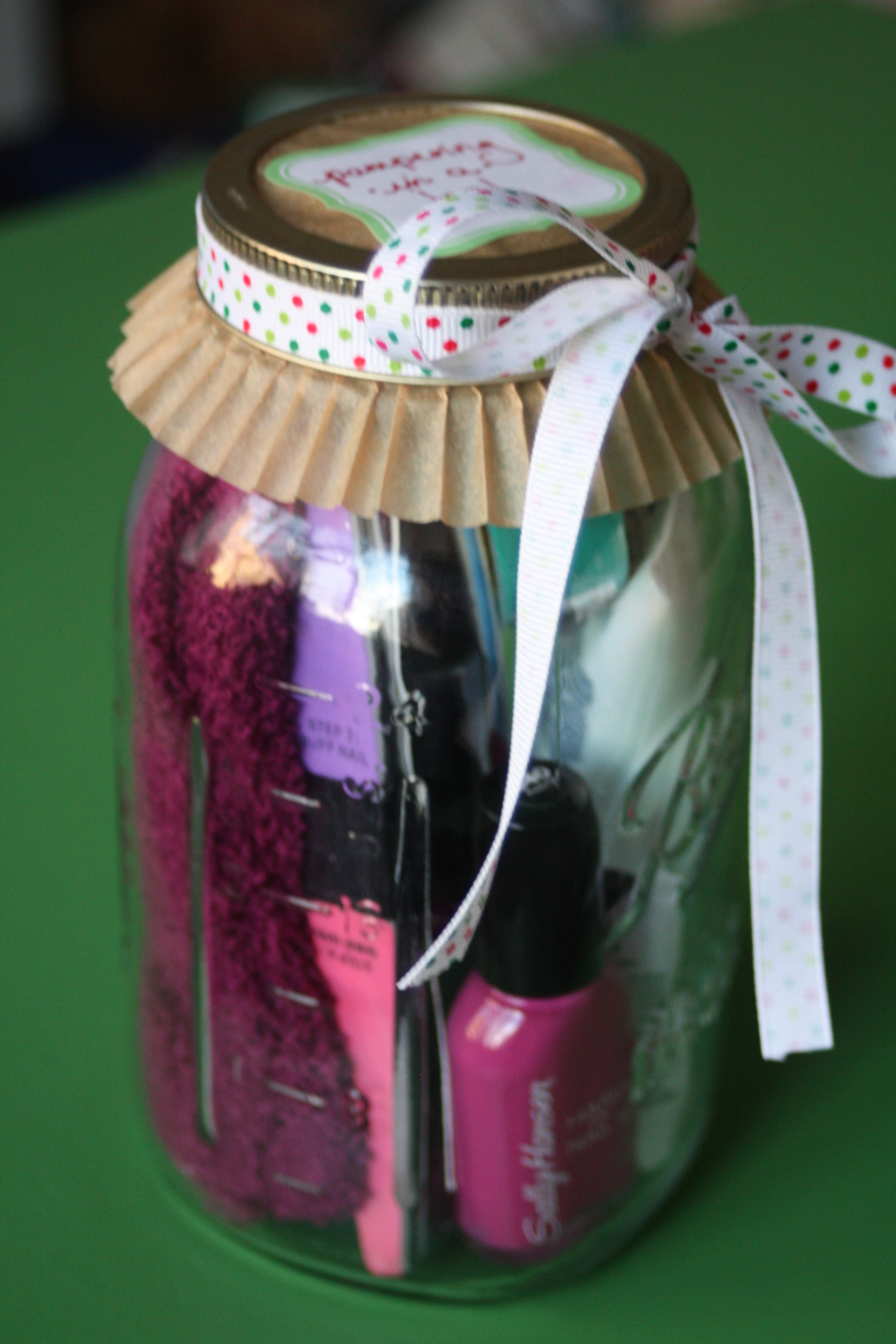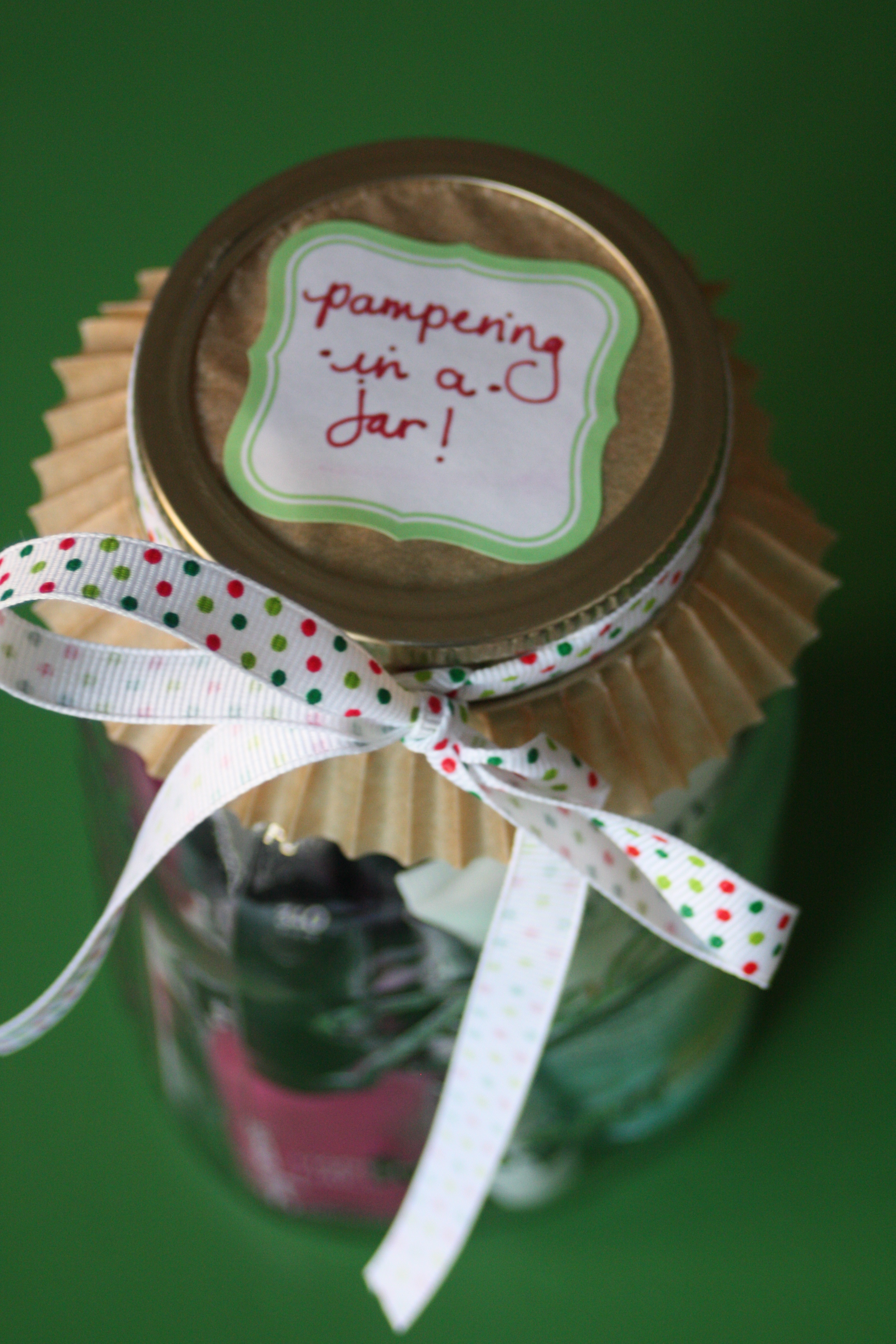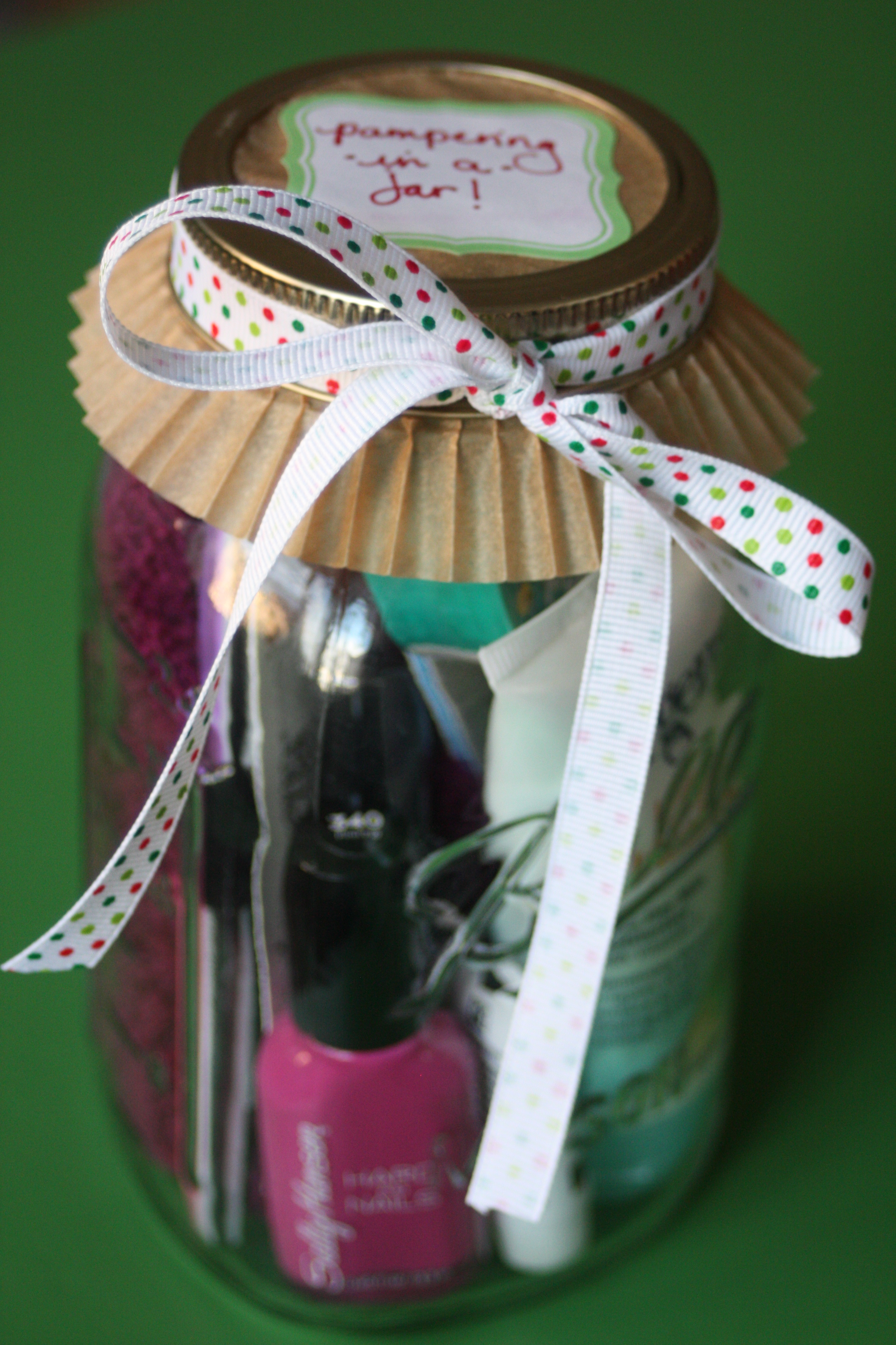 The first one I made, and I made a few of them, was pampering in a jar. It was super easy, total cost was about $6-7 each – I shopped sales and used coupons and also had some items in my stock pile already – and they’re small and easy to ship. Here’s what I included in the jar: