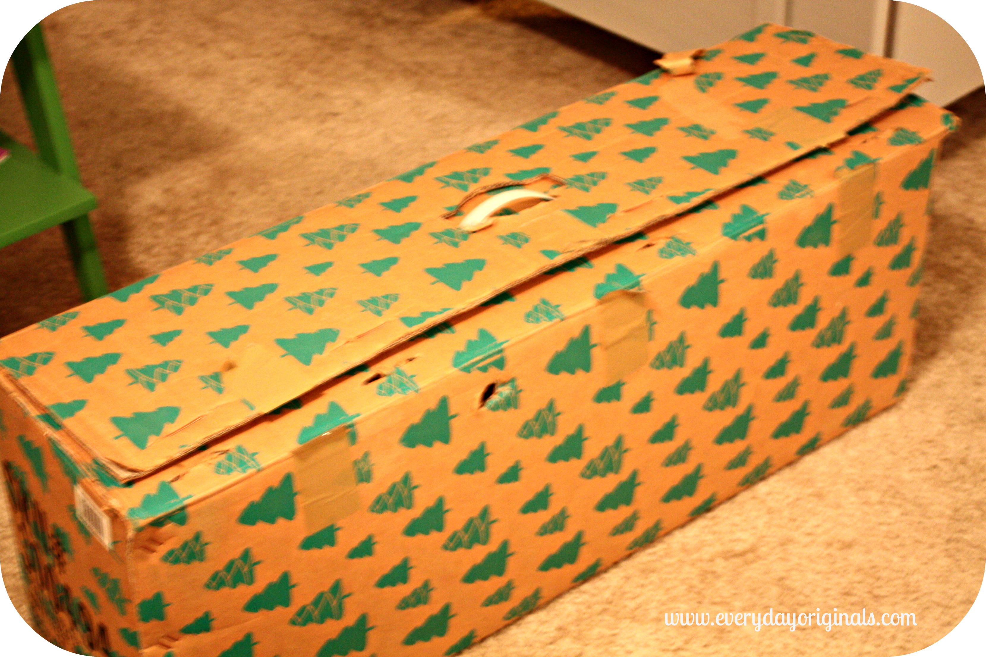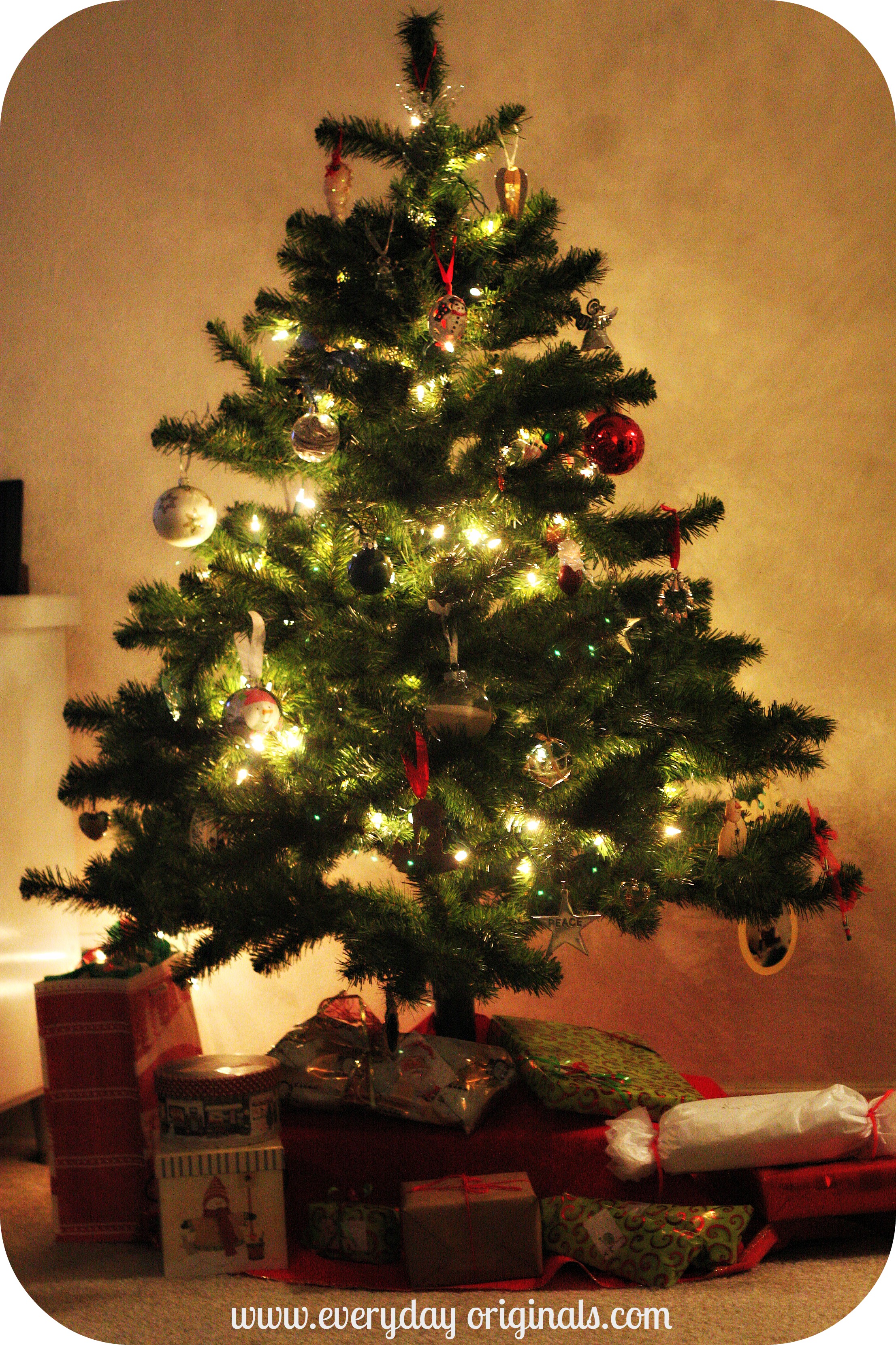 To give the tree a little height we stood it on a small plastic bin and decorated it simply with white lights and our ornaments. We’re missing a tree topper because it broke in half when we moved.